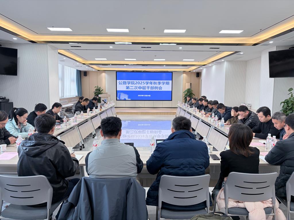 为全面统筹推进学院各项事业有序开展,切实做好年底总结工作,确保学院年度工作圆满收官与稳步推进,12月24日下午,公路学院在北校区六楼第三会议室召开2025-2026学年秋季学期第二次中层干部例会。学院领导班子、各系(中心)主任、党支部书记及科级干部参加会议。会议由学院党委书记张久鹏主持。